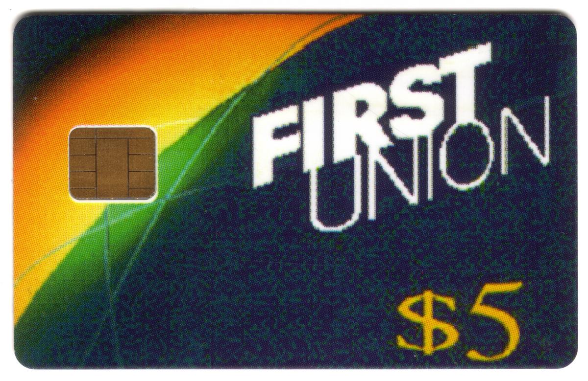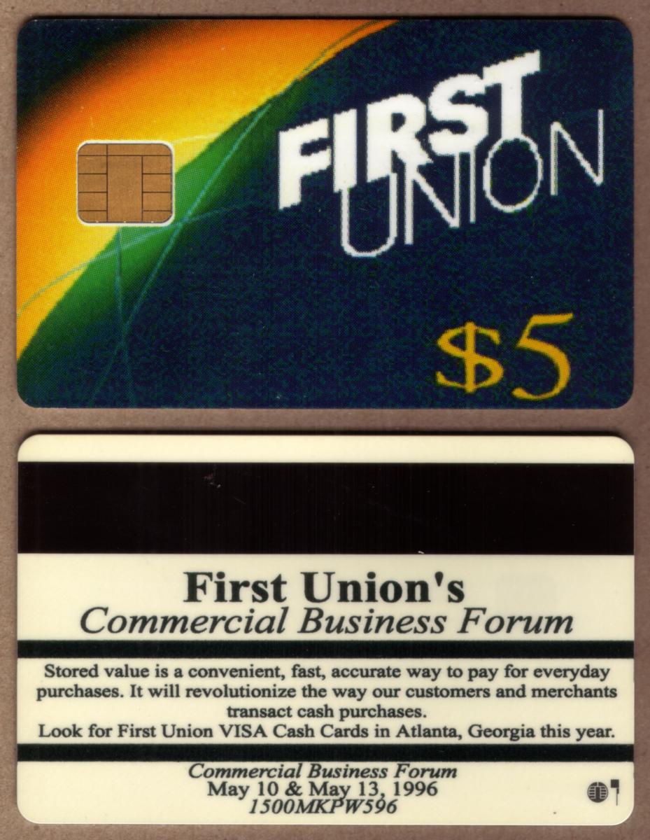 Close-up of First Union promotional card from 1996 featuring $5 value, smart chip, magnetic stripe, vibrant gradient background, and commercial messaging. |