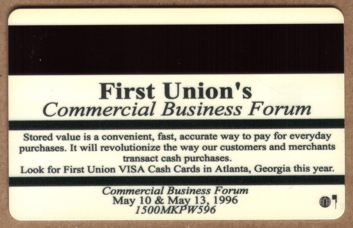 The card includes a gold chip embedded on the left side, indicating its function as a smart card with chip technology. This card was issued by First Union Corporation and is associated with the First Union Commercial Business Forum held on May 10 and May 13, 1996. The card utilizes magnetic stripe technology combined with the chip for secure transactions.