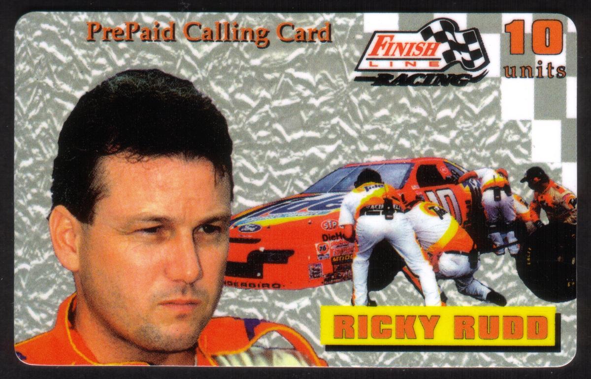 The top of the card displays the text "PrePaid Calling Card" and the Finish Line Racing logo, which includes a checkered flag motif. The card is valued at 10 units, as indicated in the top right corner. Ricky Rudd’s name is prominently printed at the bottom right in bold yellow letters with a red outline, placed on a striped background.