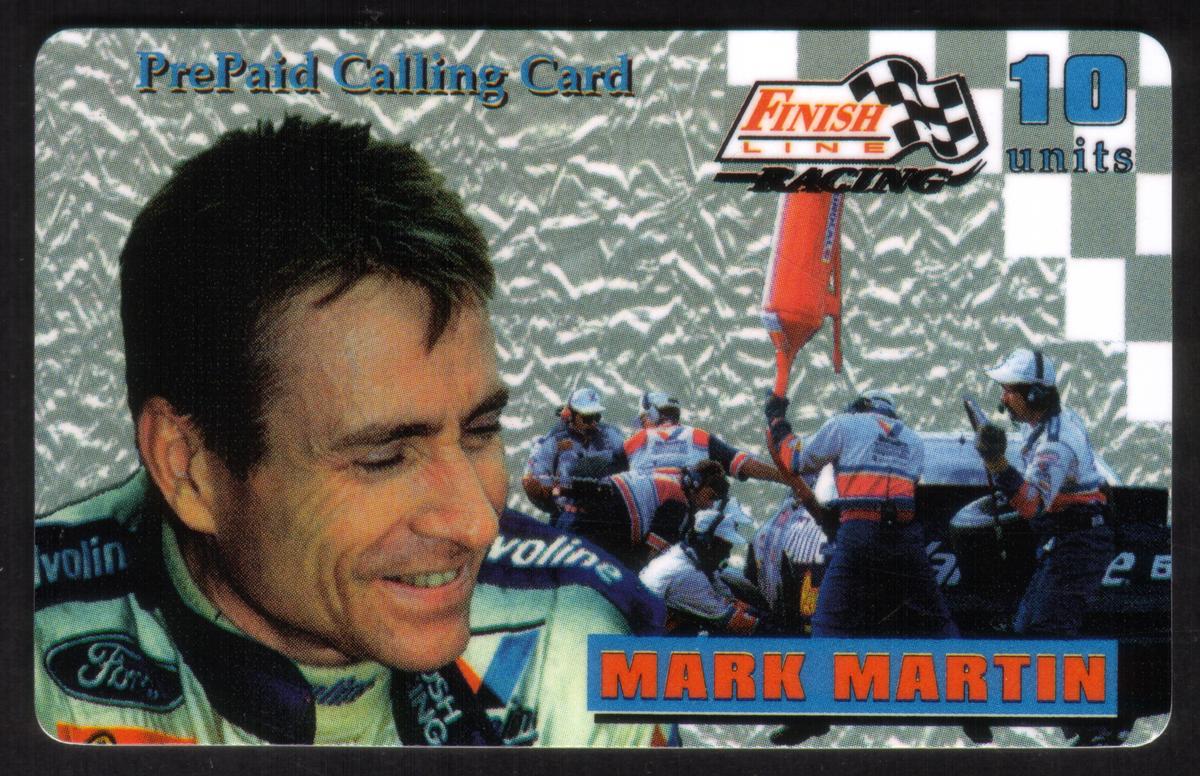 This prepaid calling card features Mark Martin, a well-known NASCAR driver associated with the Valvoline-sponsored Ford team. The card prominently displays a close-up photograph of Mark Martin smiling, dressed in his racing suit adorned with Ford and Valvoline logos. Behind him, there is a scene of a racing pit stop in progress, with crew members actively refueling and servicing a car during a race.