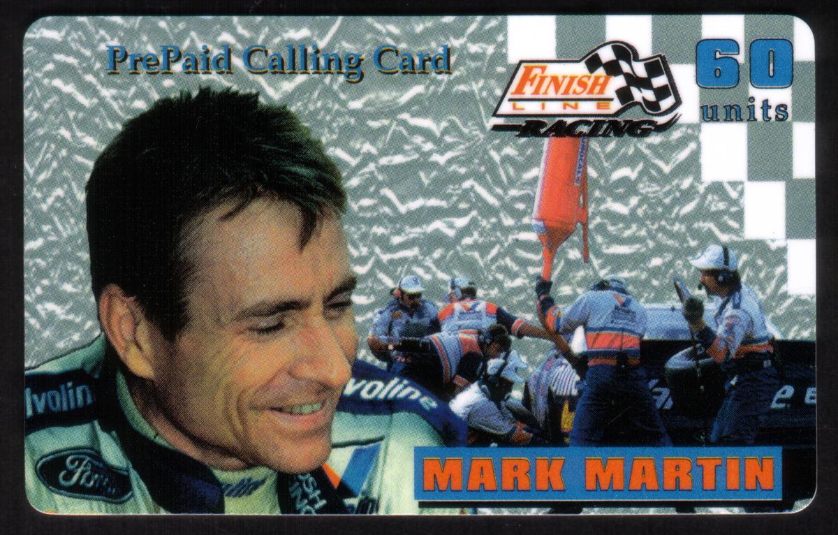 This collectible prepaid calling card features Mark Martin, the NASCAR driver, prominently on the left side of the card. He is shown with a slight smile, wearing a racing suit that bears the Ford logo and Valvoline branding. The background includes an image of a pit crew actively servicing a race car during a pit stop, emphasizing the fast-paced nature of auto racing. The pit crew members are dressed in racing uniforms with blue and orange colors that correspond to the Valvoline branding.