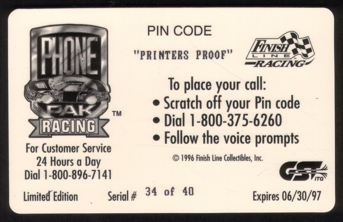| PhonePak 1996 $50. Mark Martin (Valvoline...) Serial # Printers Proof |