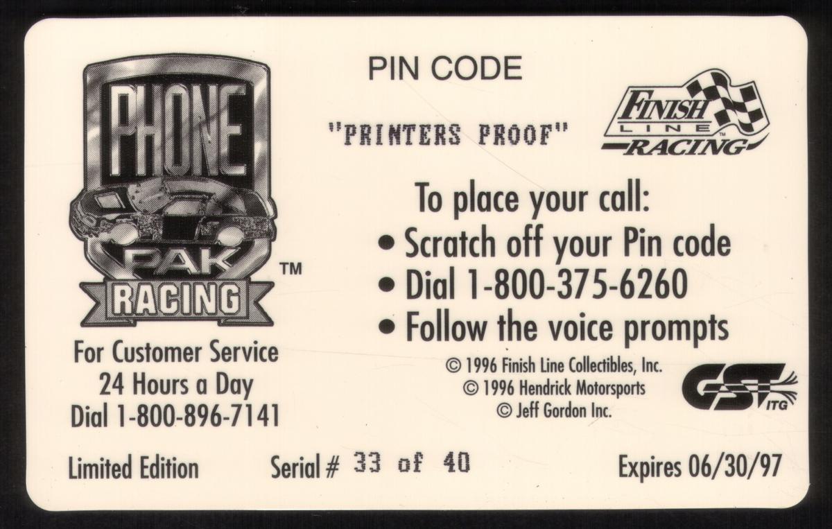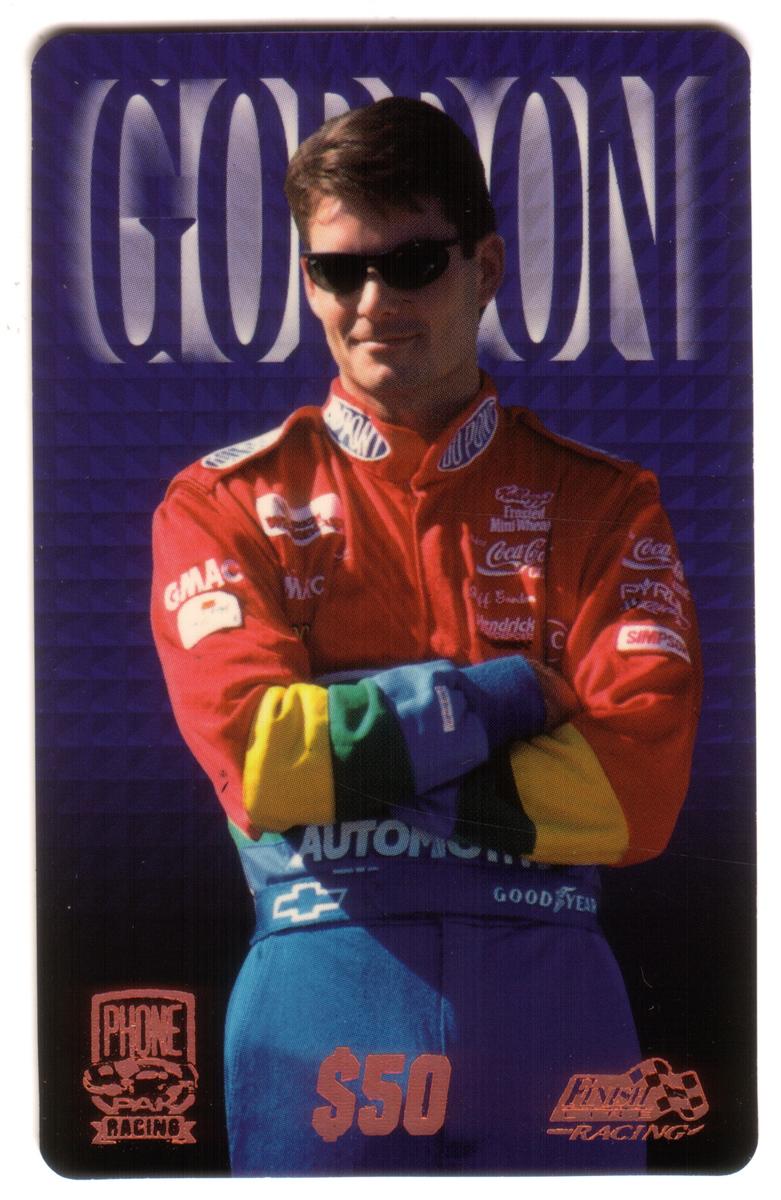 This collectible card highlights Jeff Gordon during the mid-1990s era, specifically connected to the 1996 Goodyear PhonePak series, celebrating his role in auto racing and NASCAR with his signature corporate and team affiliations clearly visible on the racing suit.