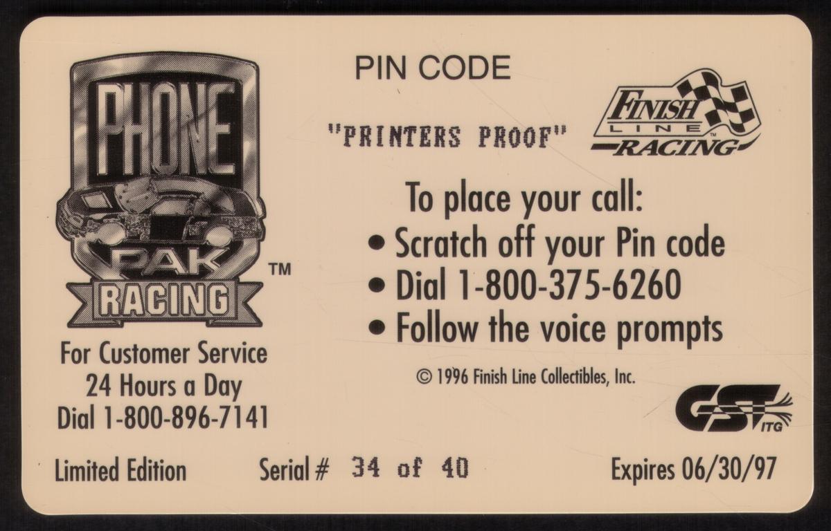This phone card is a Printer's Proof edition from Finish Line Racing. It highlights Bobby Labonte in his racing gear with clear branding of his sponsors and represents an official collectible linked to auto racing, specifically NASCAR.