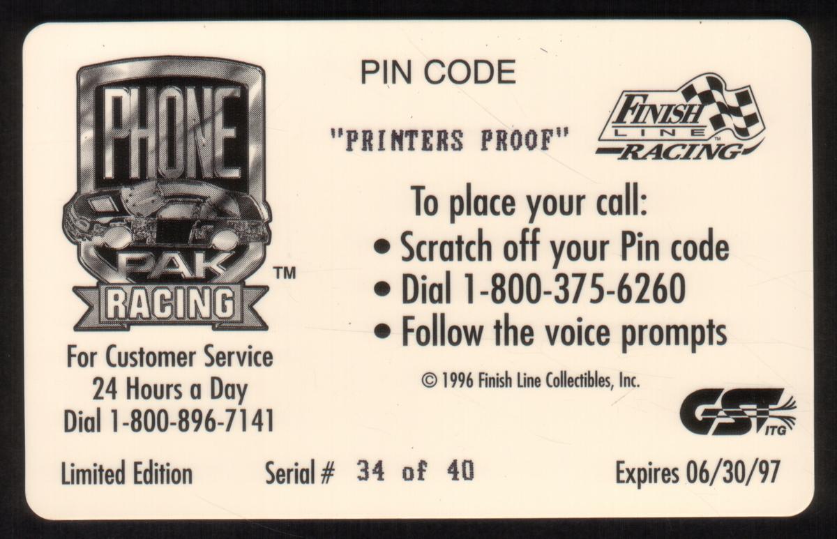 | PhonePak 1996 $50. Ricky Rudd (Tide, Ford) Serial # Printers Proof |