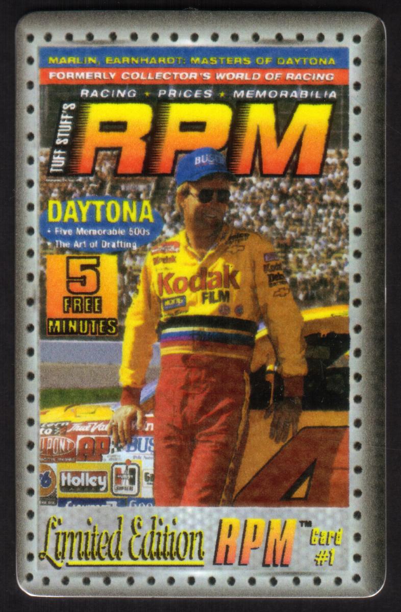 The card’s design prominently incorporates the Daytona 500 event, which is the premier race in the NASCAR series. The title "5M RPM Auto Racing Magazine Cover" is printed on the card, reinforcing the connection to motorsport media and Sterling Marlin’s presence in the sport during that period. The combination of automotive imagery and corporate trademarks such as Kodak and Busch Beer reflects the sponsorship atmosphere typical of NASCAR racing.
