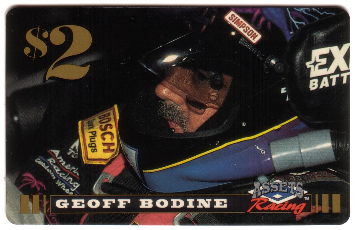 This card commemorates Geoff Bodine’s association with the 1995 racing season under the Assets Racing team name. The emphasis on the Bosch Spark Plugs brand and racing iconography connects it to genuine auto racing collectors and fans of NASCAR history.