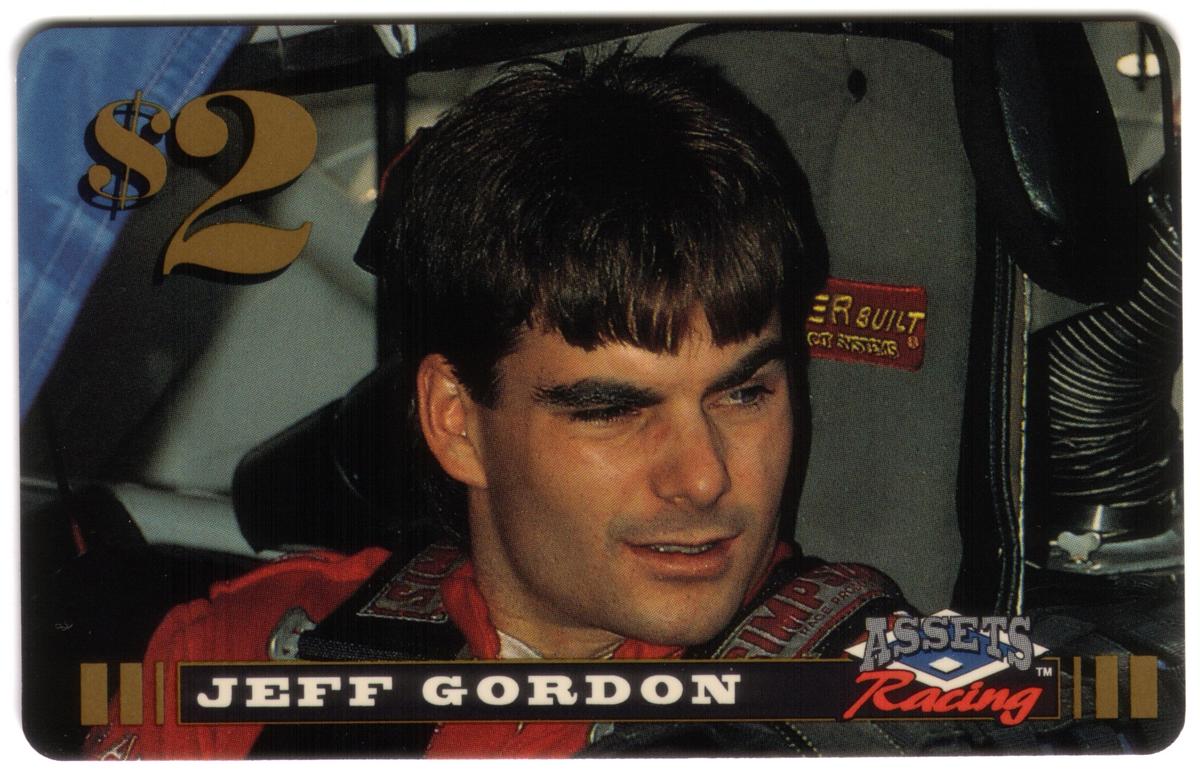 Text on the card identifies Jeff Gordon, a renowned NASCAR driver, linking him with the Finish Line Racing team. The card includes the year 1995, associating it with that racing season or event. The denomination of the card is $2, placing it in the category of collectible racing-themed cards, possibly used for transactional or commemorative purposes.