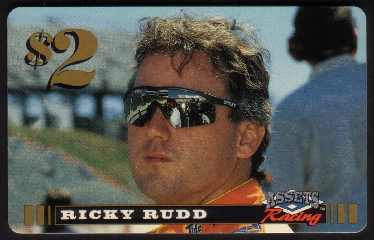 This collectible chip card features a vibrant image centered on NASCAR auto racing, specifically highlighting Ricky Rudd and the Tide Detergent sponsorship. Ricky Rudd's name appears prominently, along with the Tide logo, reflecting the 1995 racing season. The scene captures a racing automobile, showcasing the car’s colorful design that includes corporate trademarks and brand names associated with the Tide Detergent team.