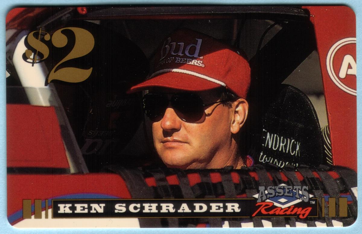 This collectible phone card features a vibrant image related to auto racing, specifically NASCAR. It prominently displays Ken Schrader, a professional NASCAR driver, associated here with Budweiser branding. The card design includes several corporate trademarks, logos, and brand names connected to the automotive and racing industries. The artwork showcases a racing scene with a focus on automobiles and the dynamic environment of a finish line in a NASCAR event.