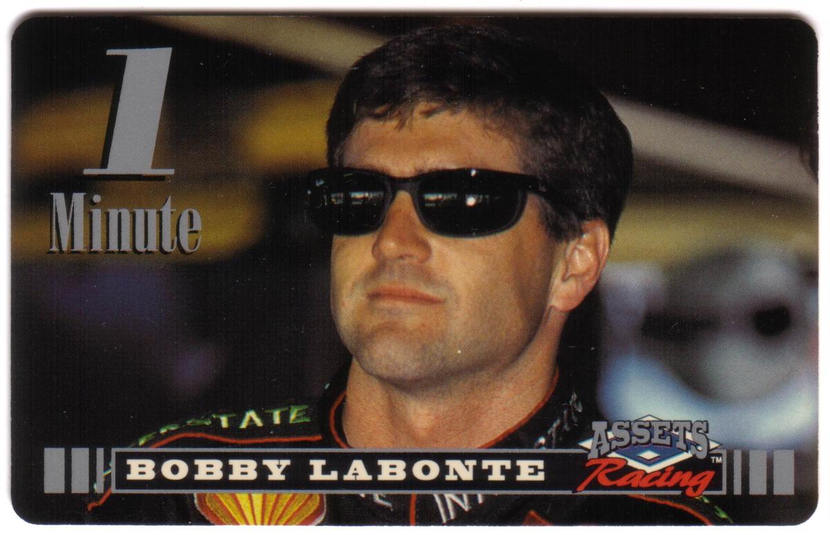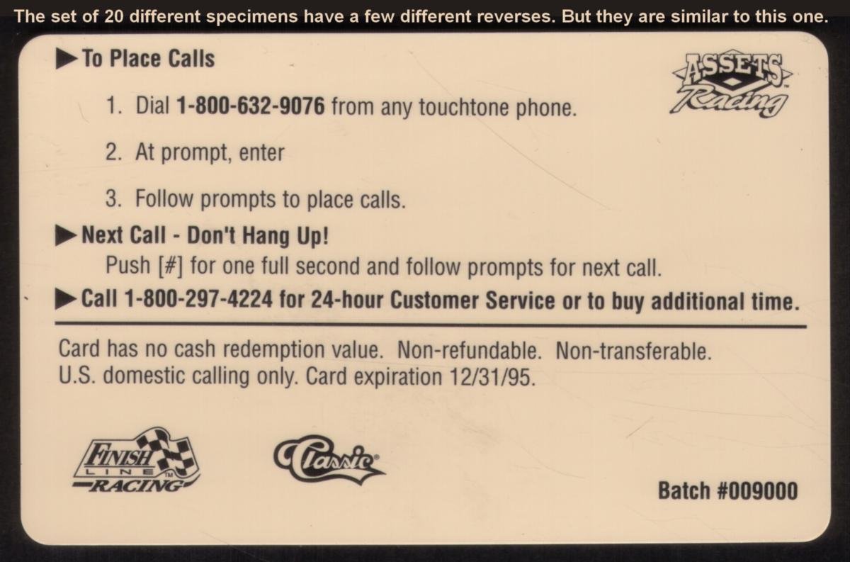 This collection of collectible phone cards features prominent NASCAR drivers from the 1995 Assets Racing series. Each card displays a photographic portrait of a driver or a race car close-up, with the driver's name printed in bold uppercase letters across the bottom. The background and setting vary but generally show the drivers in racing attire or within a racing environment, highlighting the automotive and competitive spirit of NASCAR.