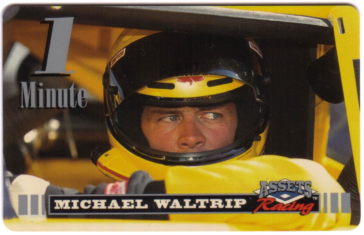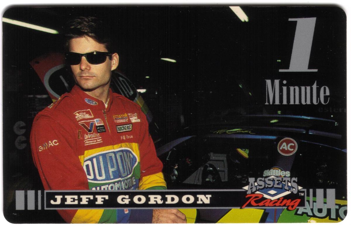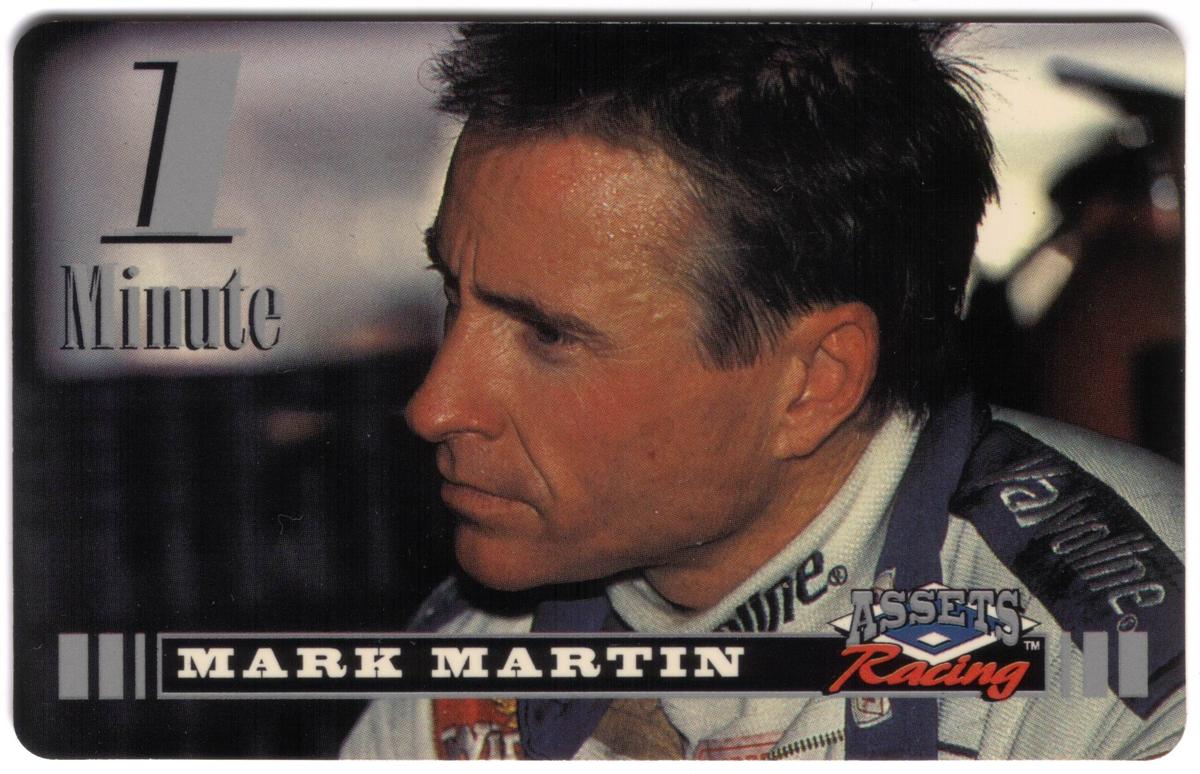 Each card prominently displays "1 Minute" in the top left corner, with the "Assets Racing" logo in the lower right quadrant. The overall design uses a stripe motif and black band behind the drivers' names, emphasizing the racing theme and collectible nature of this complete set of 20 different specimen cards.