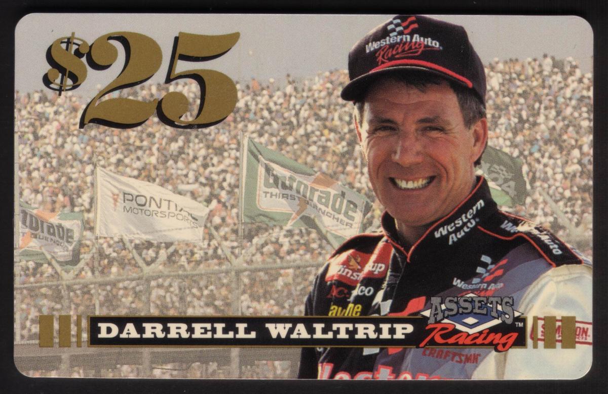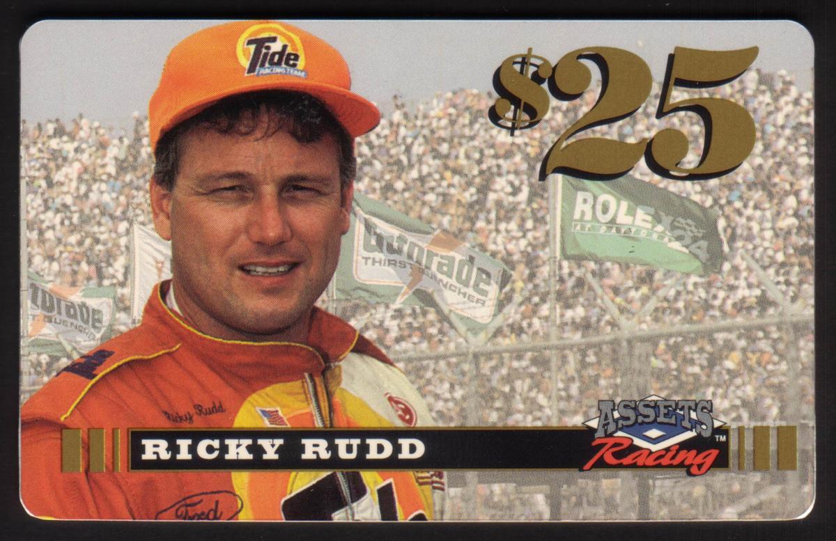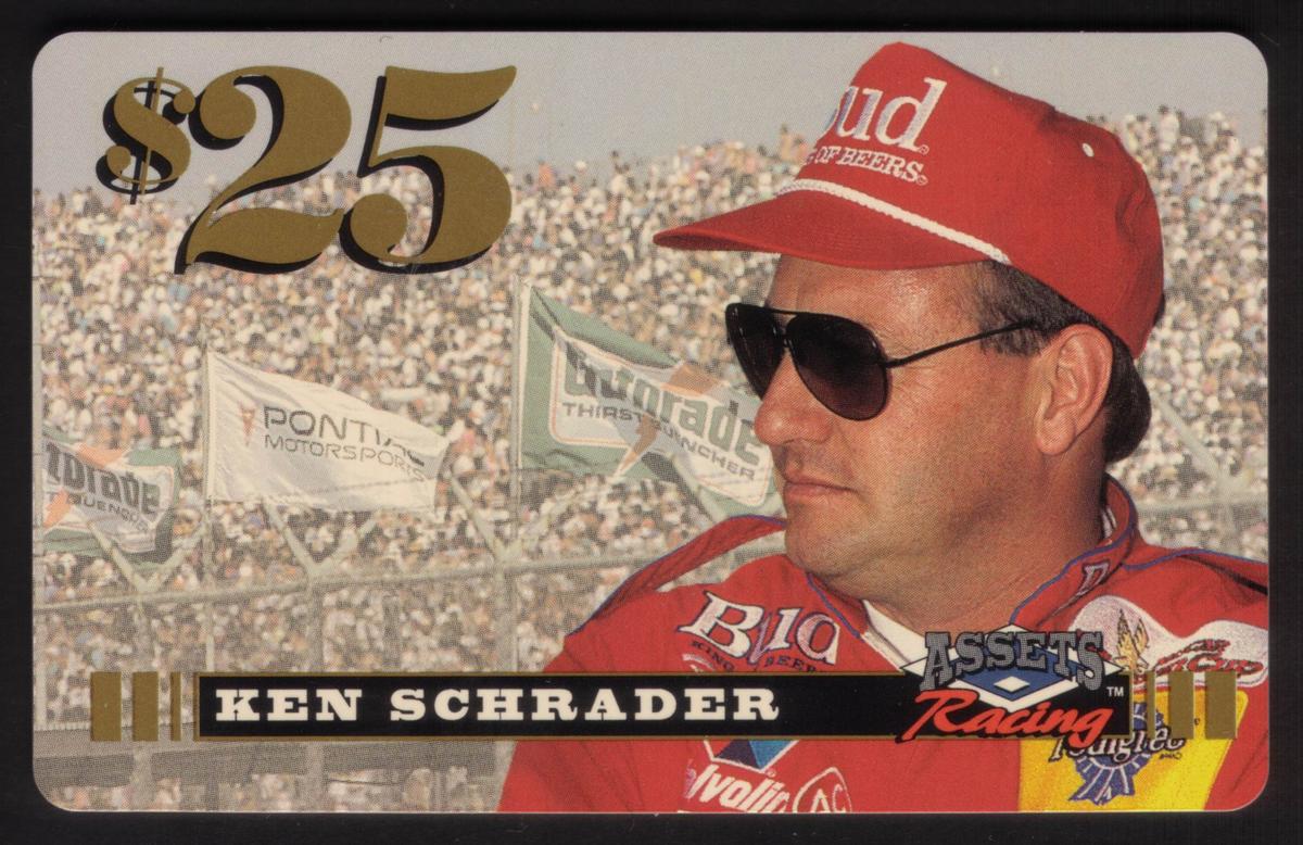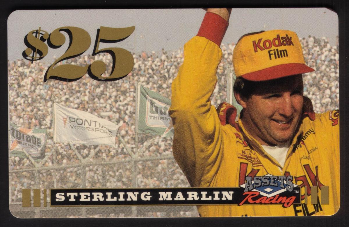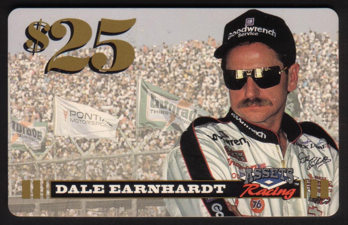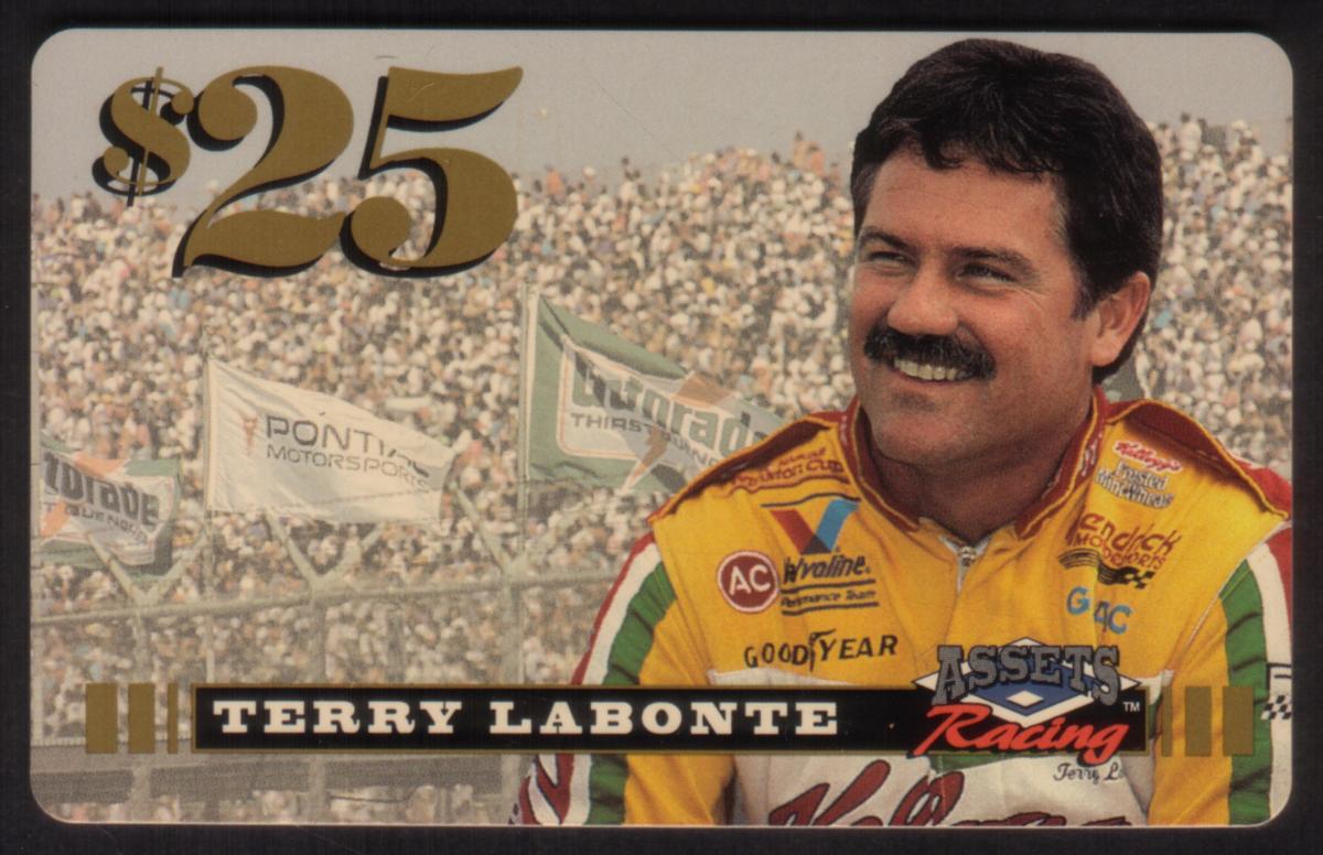 These collectible cards form a complete set of ten $25 denomination racing-themed cards from the Assets Racing 1995 collection. Each card features a prominent NASCAR driver smiling or posing against the backdrop of a crowded stadium filled with spectators and various sponsor flags such as Pontiac Motorsports and Luprade. The cards prominently display the "$25" value in gold in the top left corner and the "Assets Racing" logo in the lower right corner, alongside the name of the featured driver in bold white capital letters on a black and gold label bar near the bottom.
