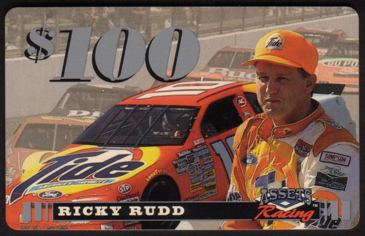 The background shows a blurred view of the racetrack wall and other race cars, emphasizing the competitive environment of NASCAR racing. The card displays a large silver "$100" denomination in the upper left corner, indicating its value. Below this, Ricky Rudd’s name is printed in bold white uppercase letters on a black strip.