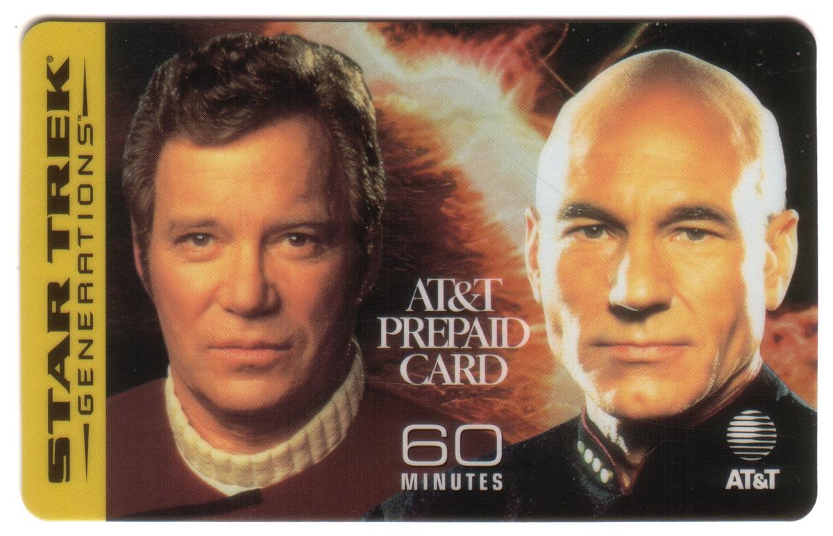 The collectible nature of this phone card is underscored by the combination of the Star Trek imagery and the AT&T branding, making it a valuable piece for fans of sci-fi and the famous captains portrayed by William Shatner and Patrick Stewart. The card’s presentation centers on the cultural and entertainment significance of the Star Trek series and the film "Star Trek Generations."