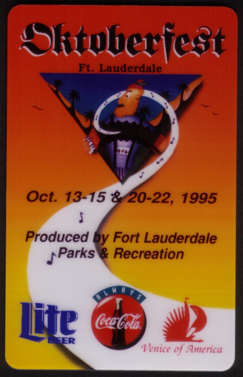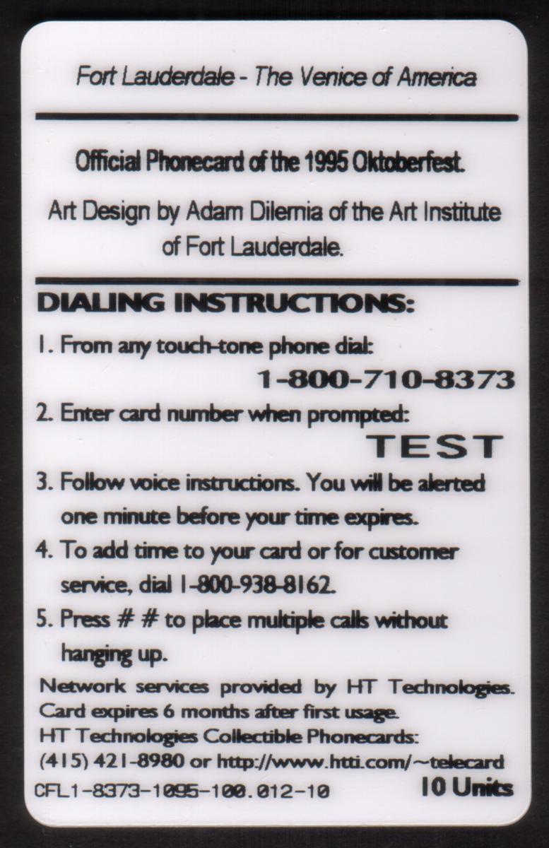 Vivid 1995 Oktoberfest Fort Lauderdale phone card featuring Bavarian man, festive background, event details, sponsor logos, and bilingual usage instructions. |