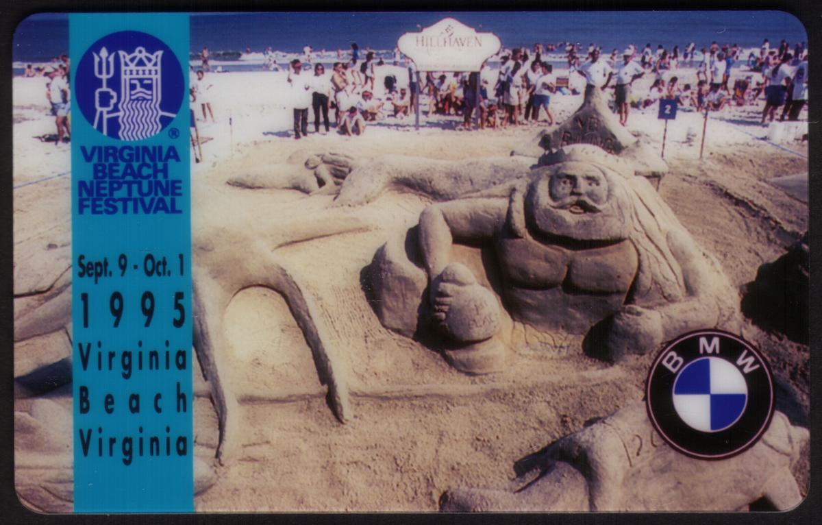 The card also features distinct logos, including the BMW car logo, emphasizing an automobile connection, specifically with BMW. Text on the card includes "10u Virginia Beach VA Neptune Fest '95 Sand Sculpture & BMW Logo TEST," signaling its association with the 1995 Neptune Festival and the automobile brand. The card’s design includes trademarks and branding tied to HT Technologies.