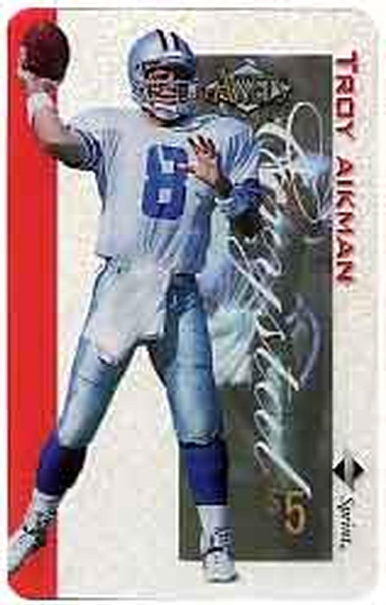 The image of Troy Aikman on the card shows him in full football uniform, including a helmet with no visible numbers, and pads. The photo captures him standing with a confident pose, holding a football in his throwing hand, ready to pass. The background consists of a dark, stadium-like setting with a hint of lighting that highlights the player and the card’s text elements.