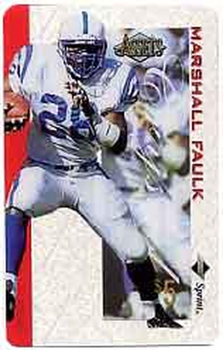 The card background is dark with a clear focus on Marshall Faulk’s image, surrounded by graphic elements that highlight the player’s name and series information. The NFL and National Football League are indicated as part of the theme, reinforcing its status as a sports collectible focusing on professional football.