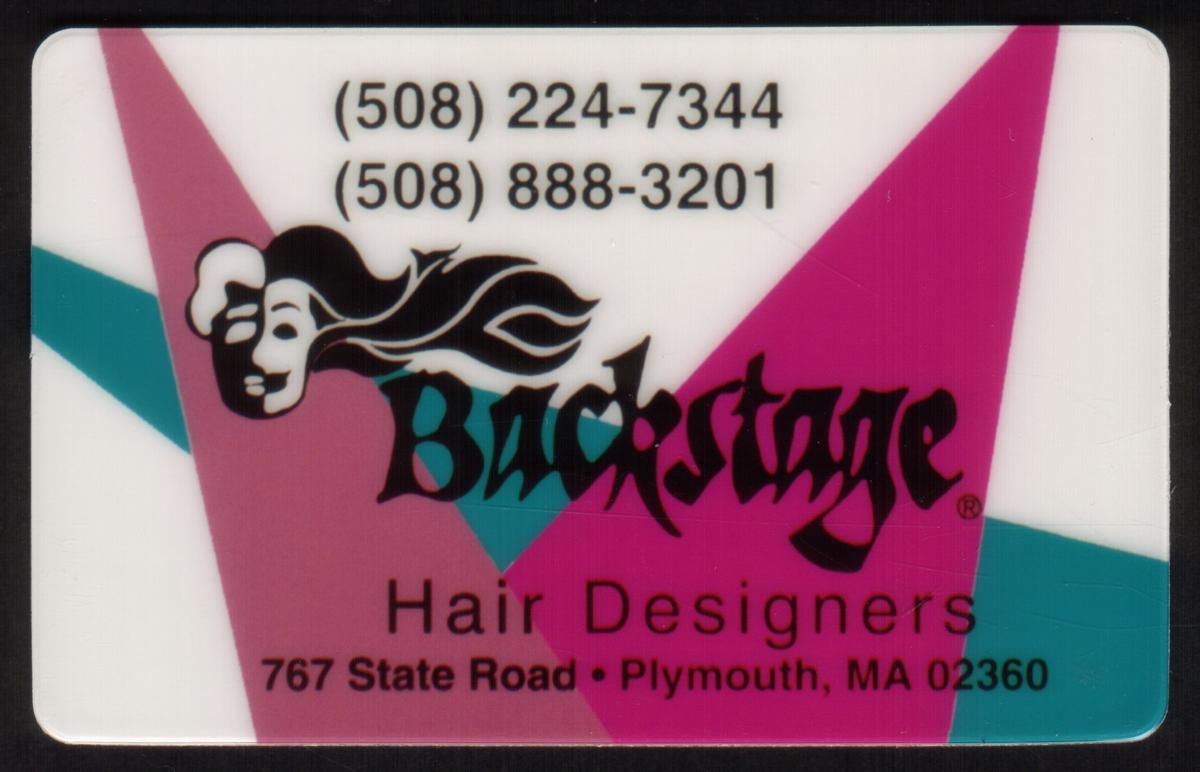 Text on the card includes the phrase "10m Backstage Hair Designers (Plymouth, MA) PROOF" along with the logo of AmeriVox, clearly linking the card to a hairdressing or hairstyling theme and the specific location of Plymouth, Massachusetts. This connection emphasizes the promotion of hairdressers and hairstyling professionals, highlighting the arts of hair cutting, coloring, and fashion within a theatrical or stage-like atmosphere.