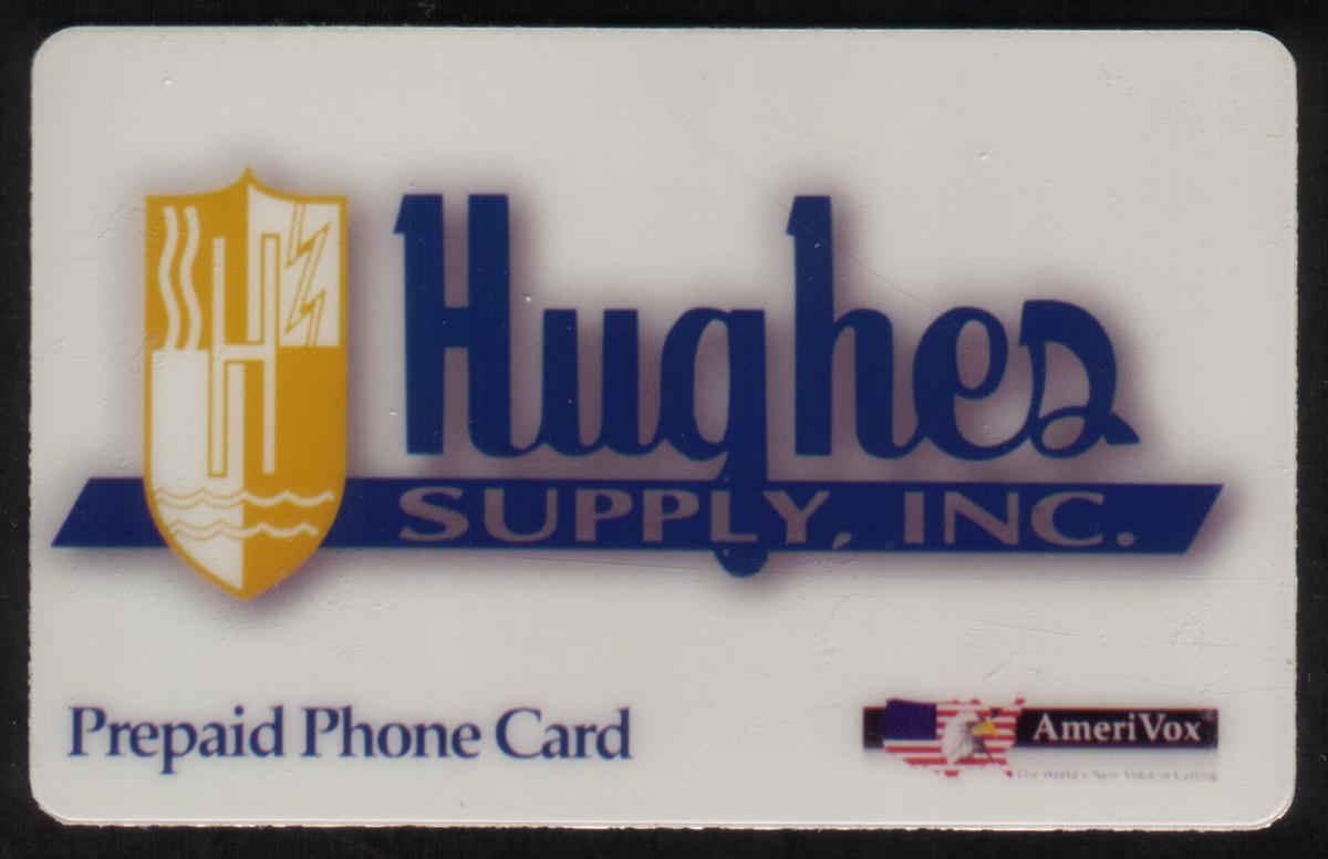 "PROOF" is printed on the card, indicating its status in the printing process, and the card was produced by AmeriVox, whose name appears near the bottom of the card. The card represents a piece of promotional business material from Hughes Supply, Inc., linked to the aerospace industry, combining graphical logos and text elements in a precise arrangement.