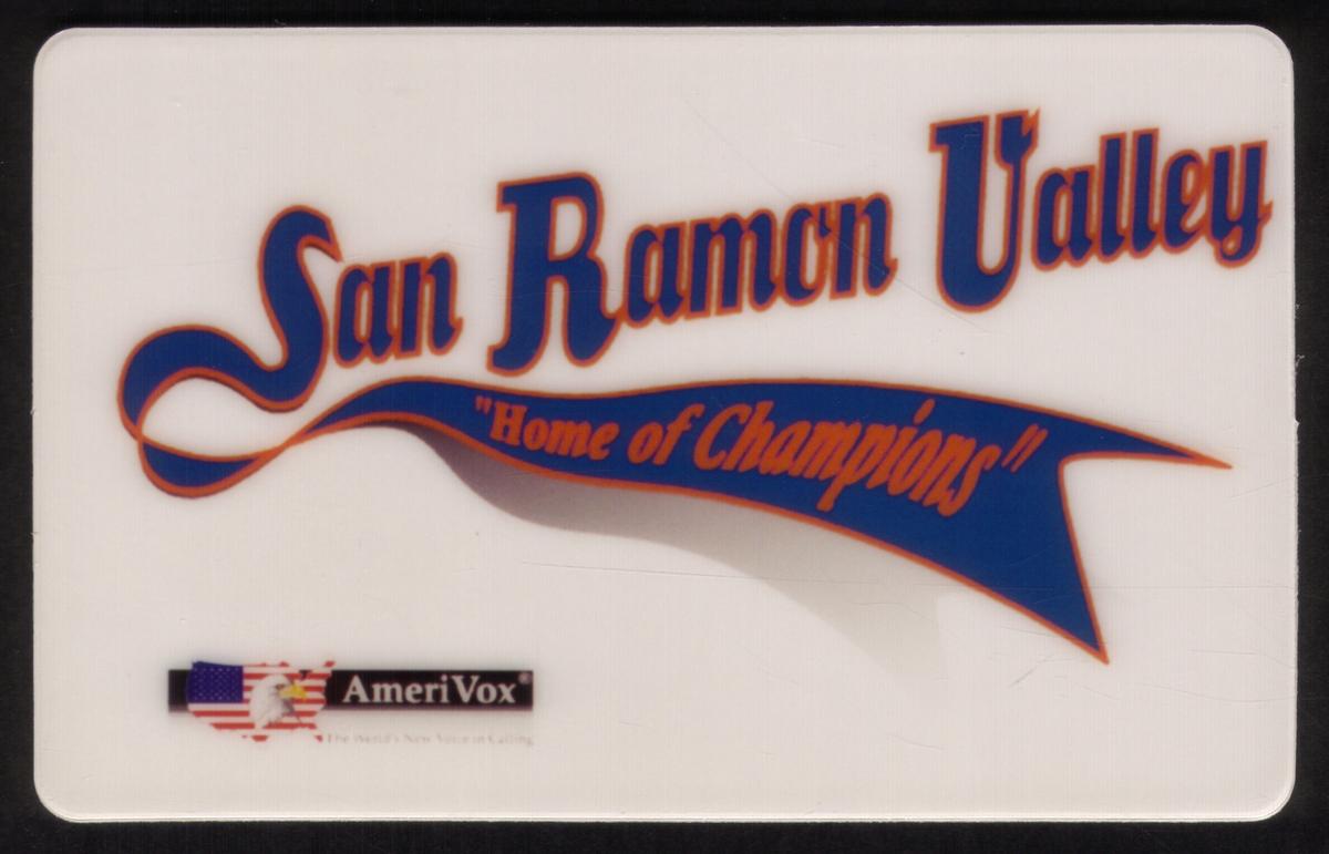 This collectible chip card features an image related to baseball and children involved in Little Leagues. The card highlights the San Ramon Valley Little League, which is referred to as the "Home of Champions." The front displays a colorful design with children playing baseball, emphasizing youth sports and community involvement. The branding includes the word "PROOF" and the name "AmeriVox," which is associated with the card’s production.