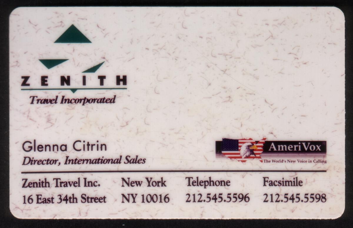 This collectible corporate business card features promotional artwork for Zenith Travel, Inc., a travel agency based in New York. The card includes the name Glenna Citrin, who appears to be associated with the company, as her name is prominently printed. The design presents the company’s branding elements clearly, with the phrase “5m Zenith Travel, Inc.” displayed on the card.