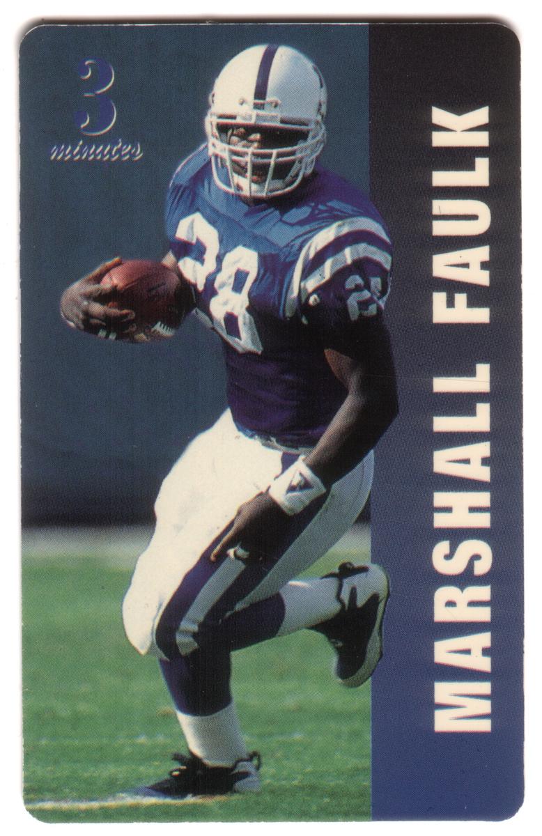 The card design prominently highlights the sport of football and the National Football League (NFL). The background is minimal, drawing attention solely to Faulk as the central figure. The image presents a clean, action-oriented moment that symbolizes the intensity and athleticism of professional football. The card references Marshall Faulk’s reputation by including his name and position in the composition.