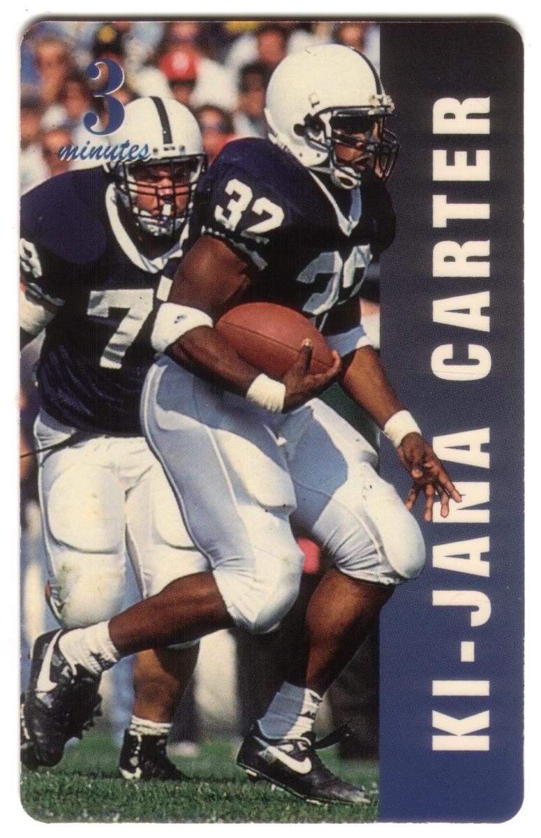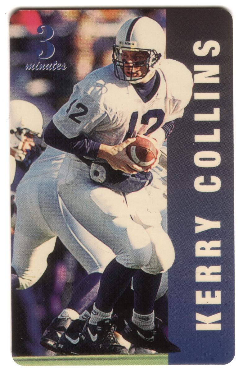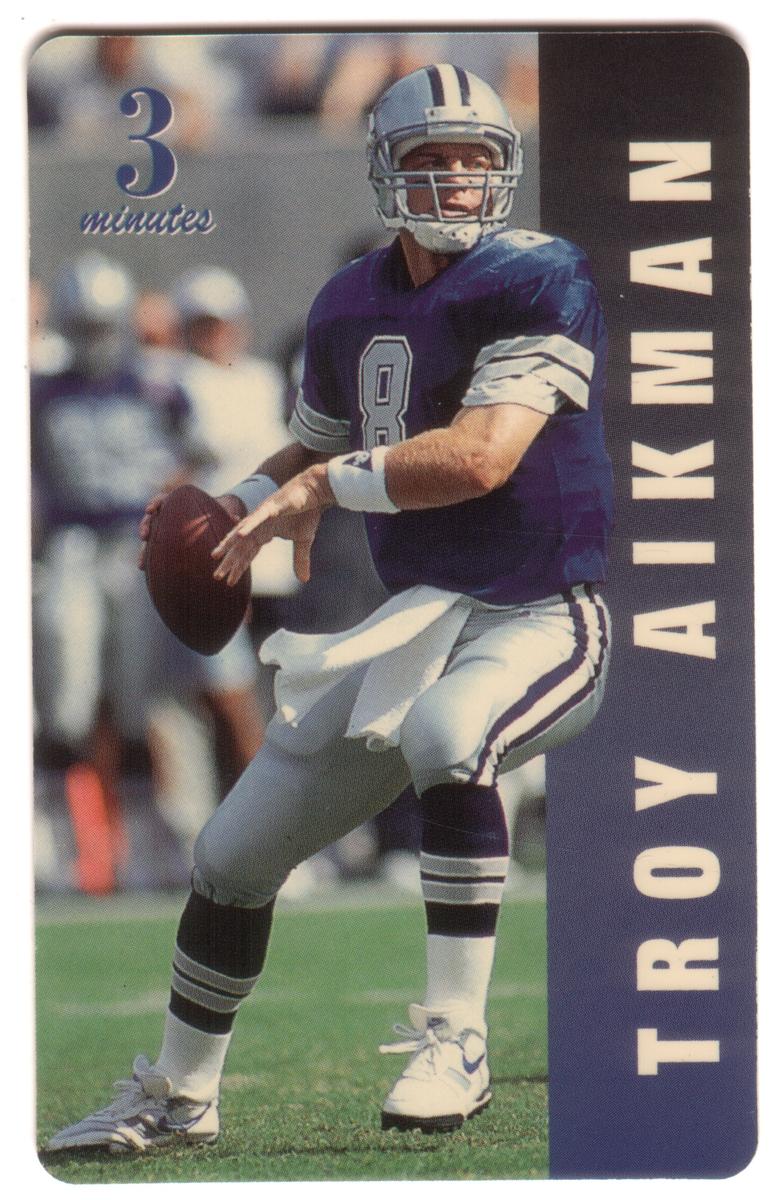 This collection features six collectible phone cards spotlighting notable football players from the NFL, each with "3 minutes" printed at the top left corner and the player’s name vertically aligned on the right side against a bold blue background. The cards highlight Roy Aikman, Ki-Jana Carter, Kerry Collins, Marshall Faulk, Steve McNair, and Steve Young.