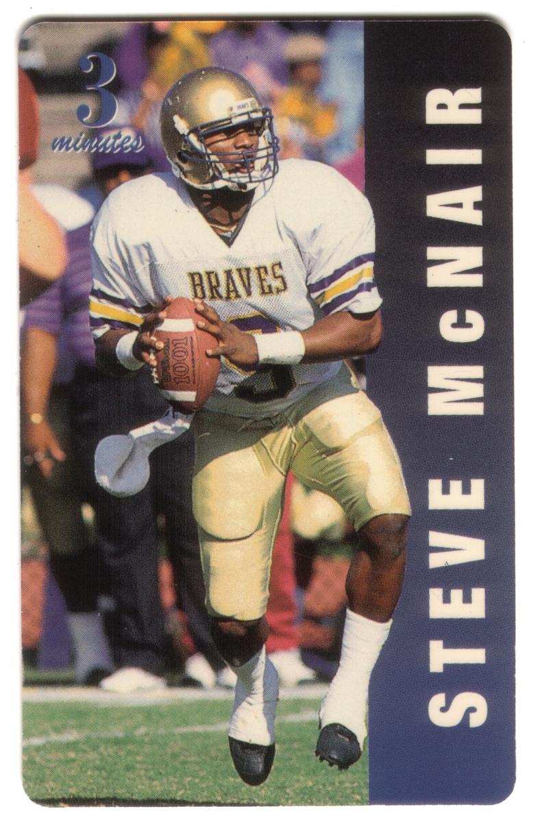 Steve McNair is shown in a gold and white Braves uniform, holding the football with both hands as he prepares to make a play on the field. Steve Young is pictured in his red and white uniform with the number 8, poised to pass with his right hand while running forward.