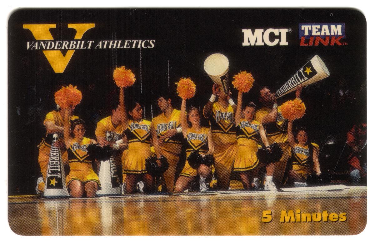 Overall, this collectible captures the energy and excitement of collegiate athletics cheerleading, with clear branding from Vanderbilt Athletics, MCI Communications, and WorldCom. The cheerleaders’ uniforms, pom poms, and megaphones are all easily identifiable, presenting a vivid representation of football cheerleading culture linked to Vanderbilt University.