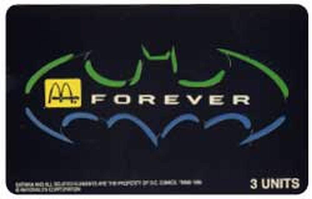 This collectible phone card features official artwork from the 1995 action adventure fantasy film "Batman Forever." The front displays the prominent "Batman Forever" movie logo alongside the McDonald’s logo, indicating a promotional partnership between the fast-food chain and the film. The card prominently showcases the title "Batman Forever," linking it directly to the Hollywood movie release from that year.