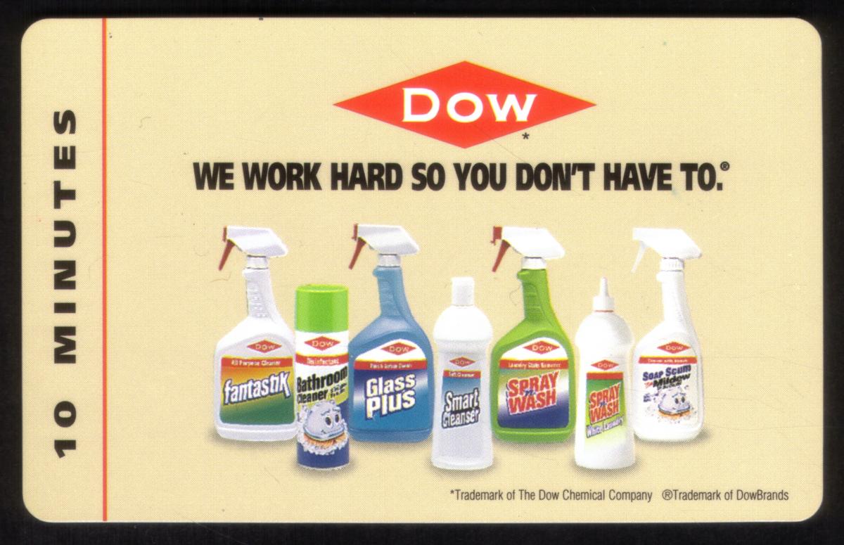On the left vertical margin, the card indicates "10 MINUTES" in black letters. At the bottom right, there are trademark notices identifying the Dow Chemical Company and DowBrands as the source of the products and trademarks. This card is a promotional advertisement highlighting Dow's range of household cleaning solutions.