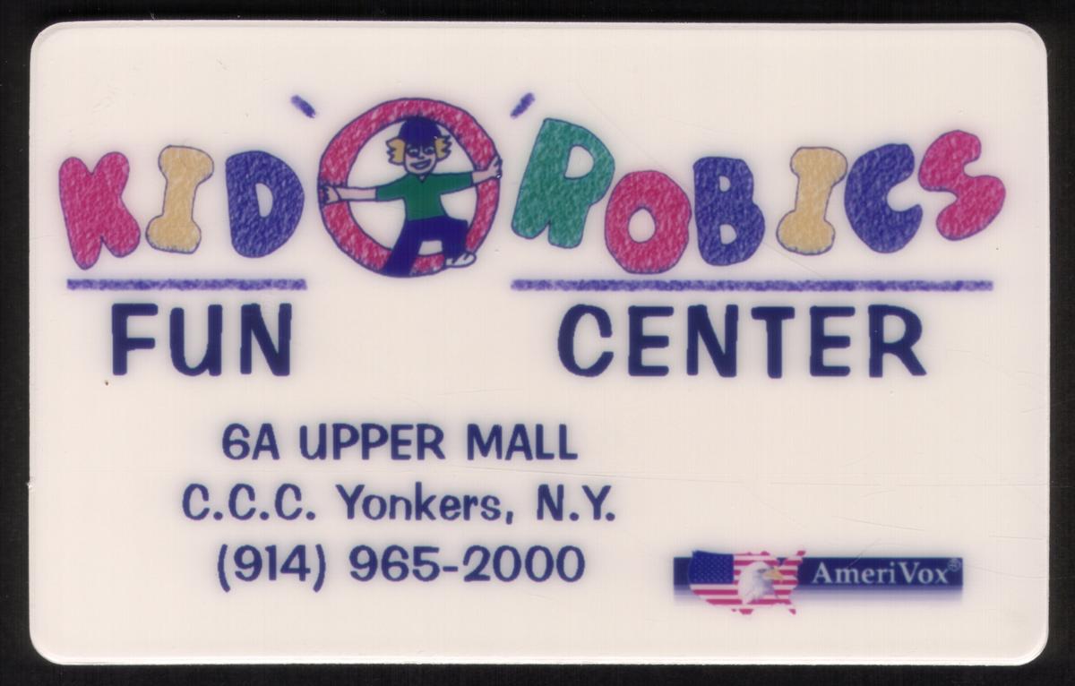 Vibrant Kid-O-Robics Fun Center phone card featuring colorful cartoon design, cheerful mascot, contact info, and AmeriVox branding, promoting children''s activities in Yonkers. |
