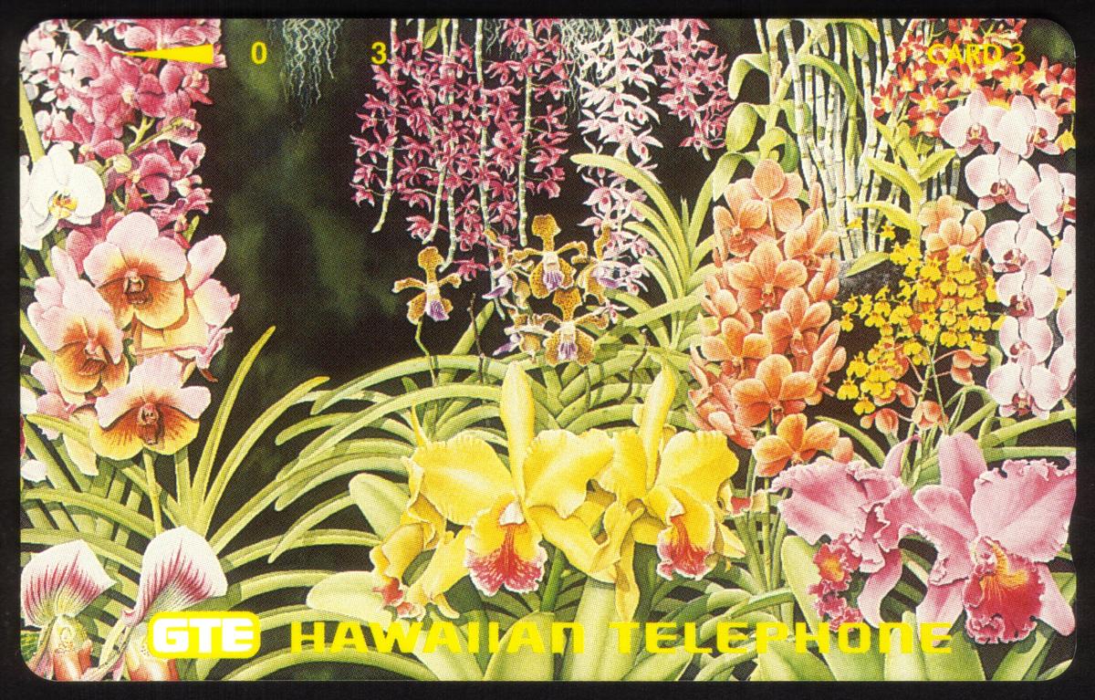 Text on the card identifies it as part of a series or collection named "Orchids of Hawaii" and displays the value designation "3u." The card’s clean layout includes the GTE Hawaiian Telephone logo, which is positioned clearly for easy recognition. The card serves as a collectible item emphasizing Hawaii’s floral diversity through detailed orchid imagery.