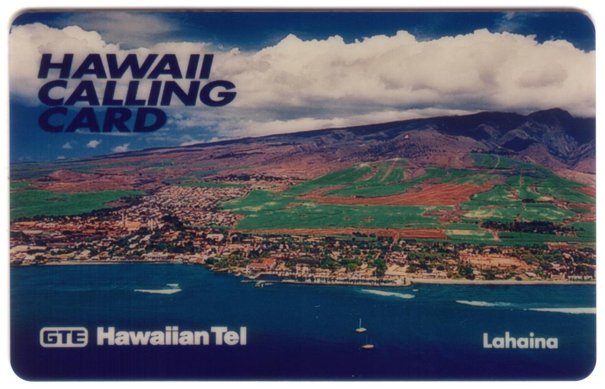The first card highlights a panoramic aerial view of the coastline and town of Lahaina. It shows a sprawling landscape that includes developed areas near the water, green fields further inland, and mountainous terrain in the background beneath a partly cloudy sky. The card text reads “HAWAII CALLING CARD” along with “GTE Hawaiian Tel” and “Lahaina” printed near the bottom.
