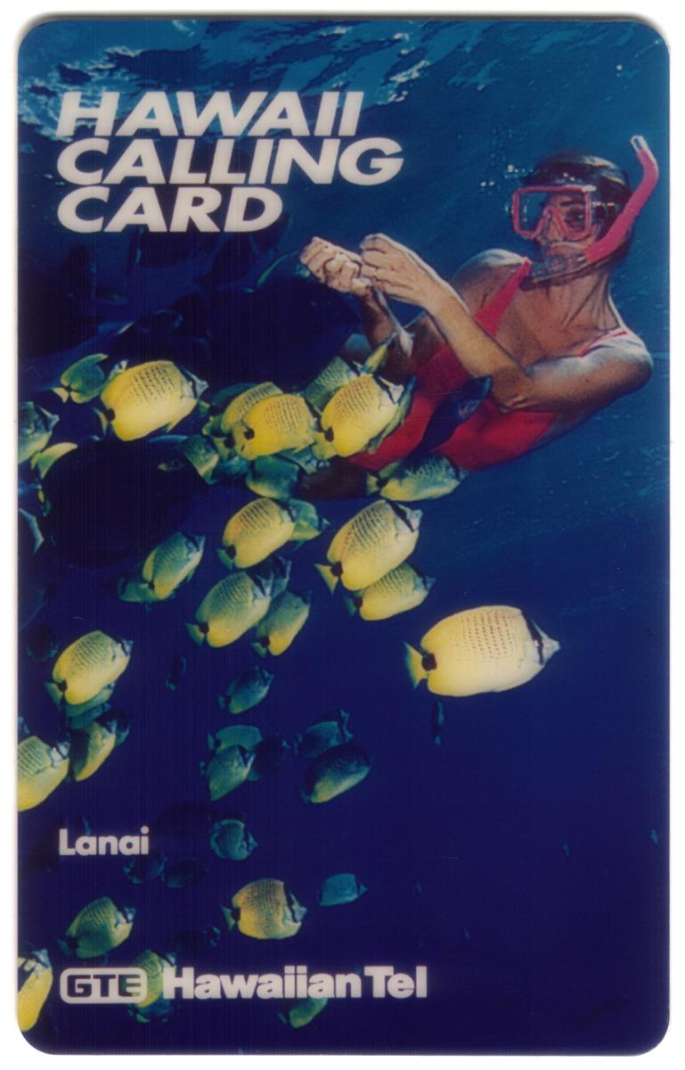 The second card captures an underwater scene off the coast of Lanai. It depicts a snorkeler wearing a red swimsuit and mask surrounded by a school of yellow butterflyfish. The person appears to be feeding or interacting with the fish. The card bears the text “HAWAII CALLING CARD” at the top, and “Lanai” with “GTE Hawaiian Tel” near the bottom.