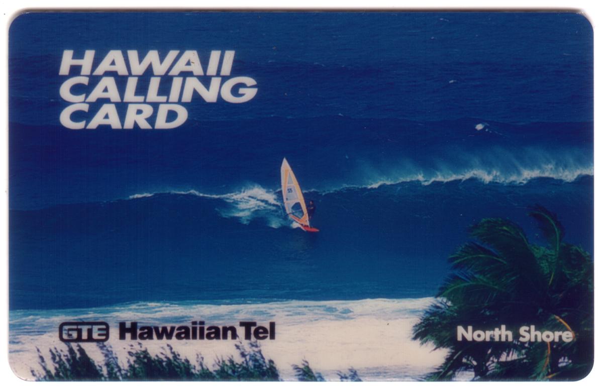 The third card shows a watersports scene on the North Shore of Oahu. A windsurfer rides a breaking wave close to the beach, with lush palm trees and coastal vegetation visible along the shore. The text includes “HAWAII CALLING CARD” prominently at the top, with “GTE Hawaiian Tel” and “North Shore” near the bottom right.