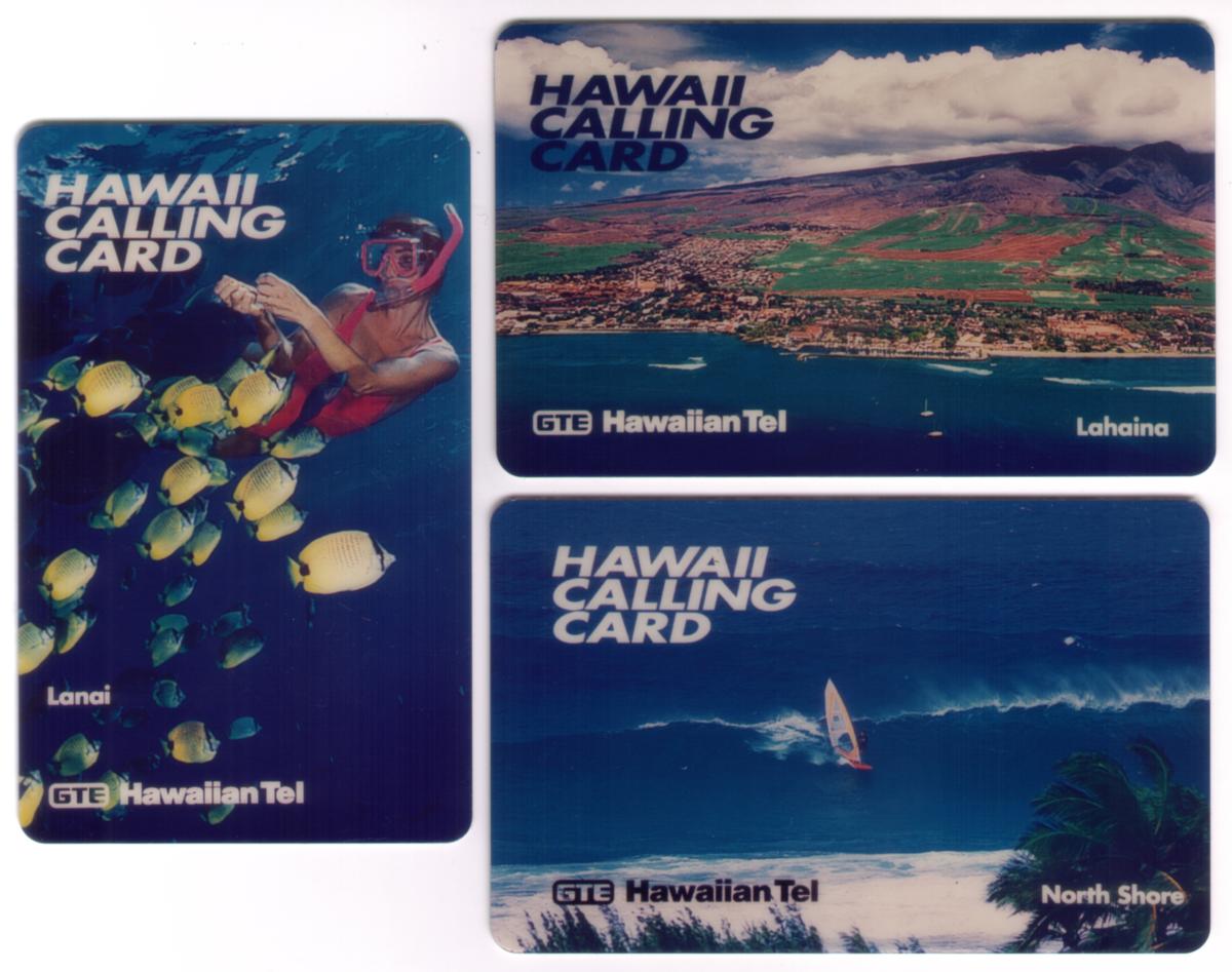 Together, these three GTE Hawaiian Tel cards form a sealed set that celebrates Hawaiian travel, water sports, and natural beauty through striking images of Lahaina, Lanai, and the North Shore. Each card’s photo and text clearly identify the location and emphasize popular scenic and recreational themes associated with Hawaii.