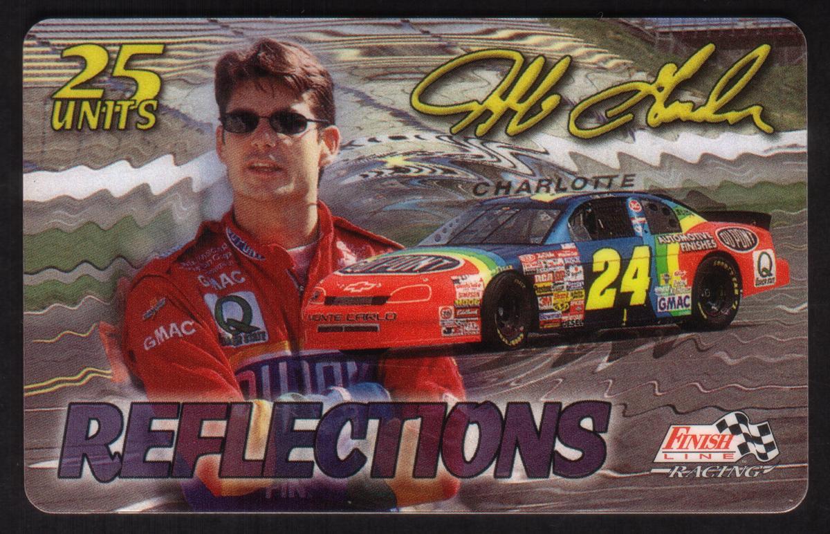 The card highlights automotive themes and racing through the presence of cars and automotive branding tied to NASCAR. The Finish Line Racing logo is displayed prominently, indicating the card's connection to auto racing memorabilia and collectors. The overall design merges the sport’s dynamic energy with Jeff Gordon's recognizable image as a prominent figure in the world of NASCAR.