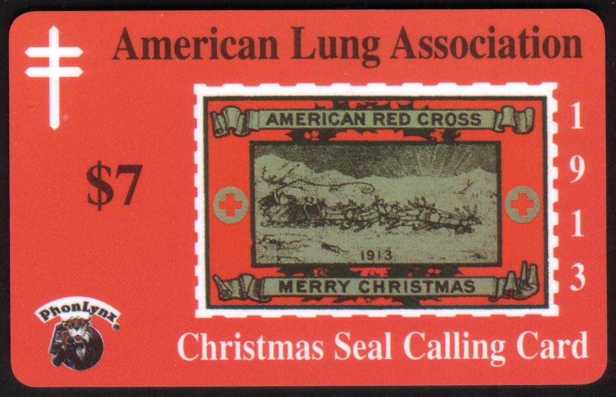 The collectible card features a $7 American Lung Association 1913 Christmas Seal Stamp with a focus on the American Red Cross and holiday themes. The card prominently displays Santa Claus in his sleigh, pulled by reindeer, flying through the sky. The imagery conveys a festive Christmas scene, highlighting charitable and nonprofit organizations associated with the holiday season, including the American Red Cross. The background is simple, emphasizing the classic holiday elements of Santa, the sleigh, and reindeer.