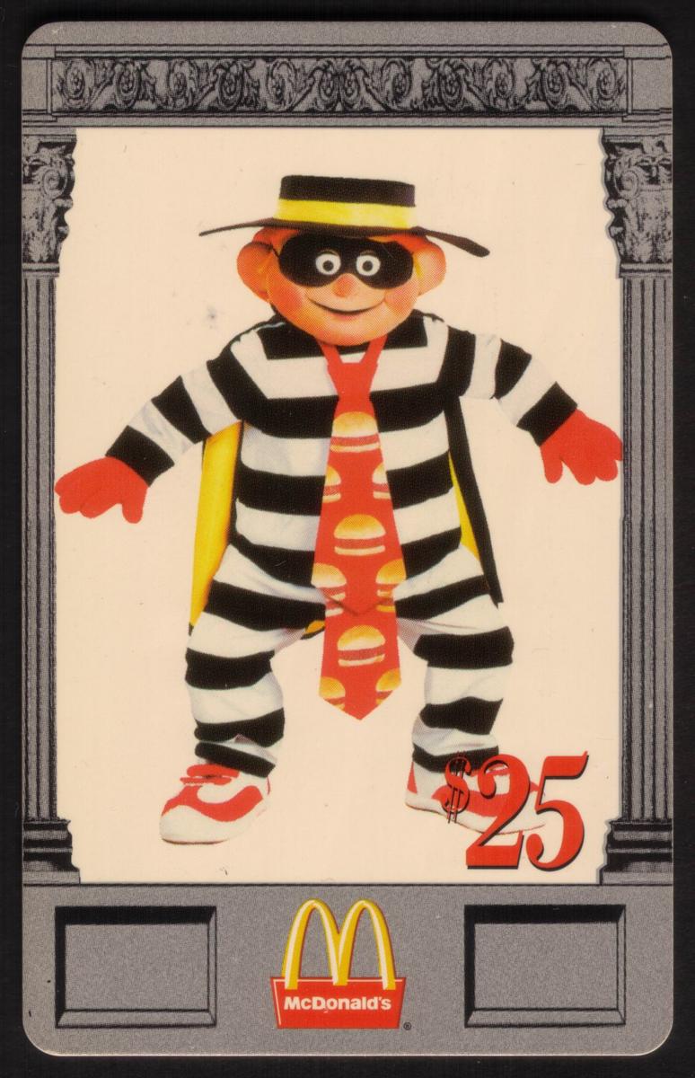 The card is rectangular and glossy, standard for collectible chip cards released during the mid-1990s. It reflects McDonald’s branding through its use of the Golden Arches and the signature character, appealing to collectors interested in fast food advertisements and memorabilia. The card’s focus is on celebrating the Hamburgler and McDonald’s national event from 1996, aligning it with promotional activities and collectible trends linked to the brand and its characters.