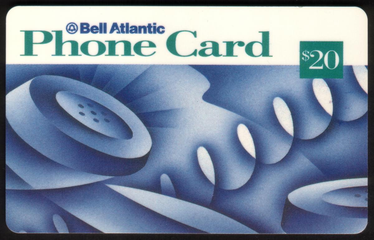 The card is marked with "$20" inside a green box in the upper right corner indicating its value. The text “Bell Atlantic” appears above the words “Phone Card” near the top center in green and blue lettering. The design emphasizes the telephone device as its central theme, combining functional imagery with artistic flair typical of collectible phone cards from this era.
