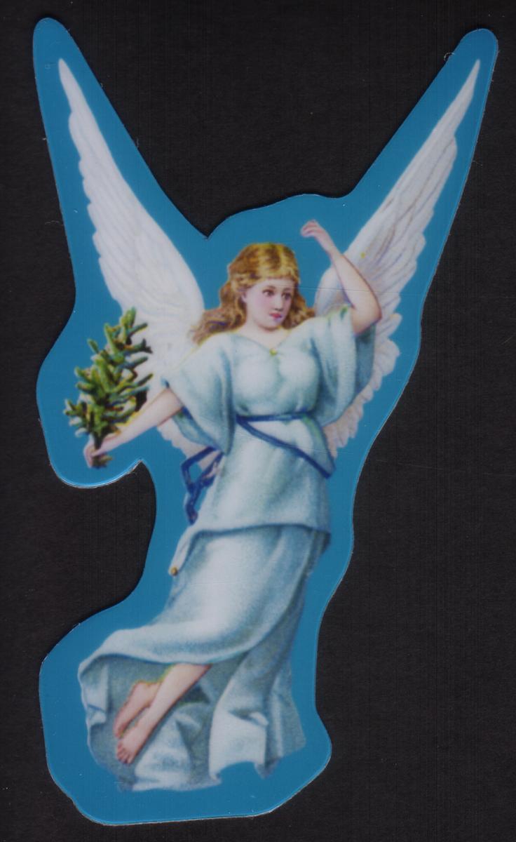 This collectible die-cut card features a detailed illustration of an angel with prominent wings spread outward. The angel is centered against a turquoise background, which provides a vibrant contrast that highlights the figure. The wings are white with feathered detailing, and the angel's robes appear to have soft folds, emphasizing a sense of grace and spirituality.