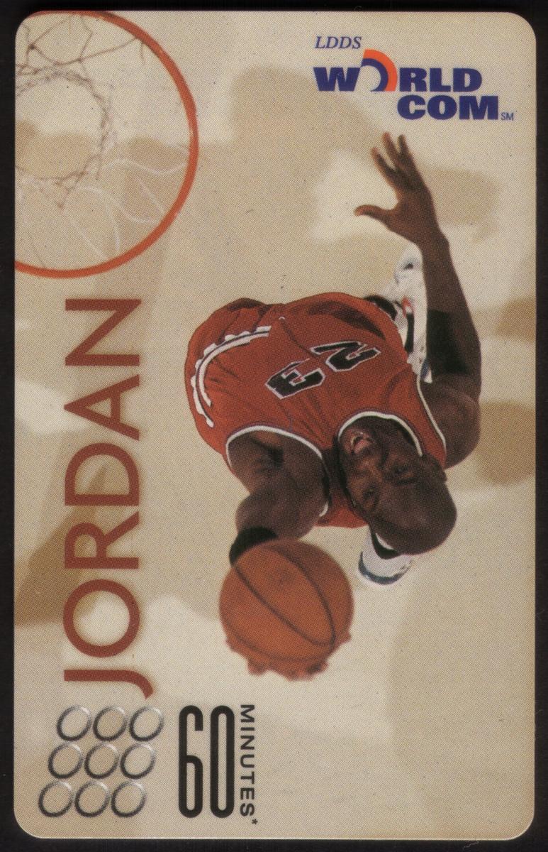 The card includes the text "JORDAN" vertically along the left side, and the denomination of "60 MINUTES" at the bottom, which indicates the amount of stored value or time for use in telecommunications. The LDDS WorldCom logo is prominently displayed in the upper-right corner. The design and image highlight Michael Jordan as a famous sports figure, making this card notable for basketball fans and collectors.