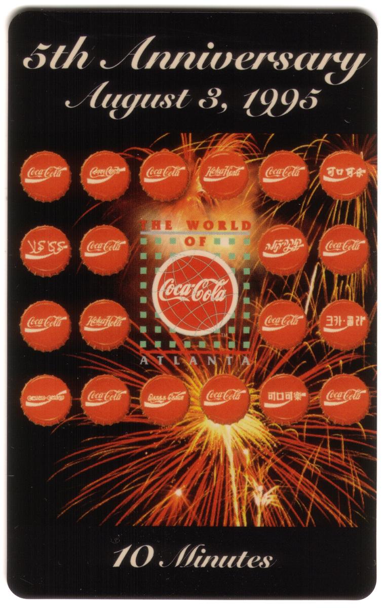At the top of the card, elegant silver script reads "5th Anniversary August 3, 1995." The bottom of the card shows the text "10 Minutes," indicating the card’s value or usage duration. The imagery of fireworks paired with the repeated Coca-Cola logos emphasizes celebration and global recognition.