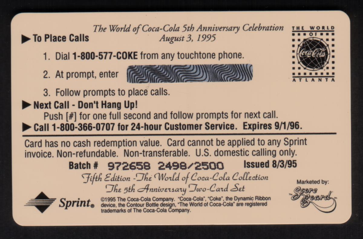 This collectible phone card commemorates the 5th Anniversary of the World of Coca-Cola in Atlanta, dated August 3, 1995. The design features a black background with orange fireworks bursting upward, creating a festive atmosphere.