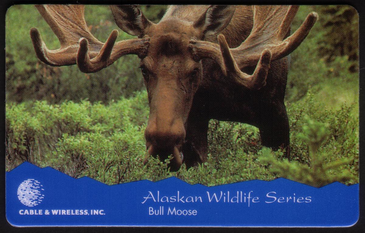 The card is part of the 5m Alaskan Wildlife Series and includes the name "Johnny Johnson," credited as the photographer. The issuing company is Cable & Wireless (CWI). The text and design elements on the card are clear and neatly arranged, providing information about the series and the subject without cluttering the visual focus on the bull moose.