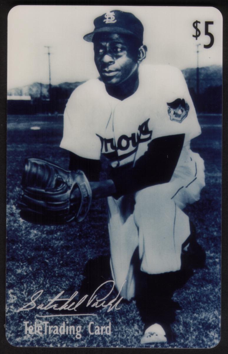 This collectible phone card features a black and white photographic image of Satchel Paige, a legendary baseball player known for his outstanding pitching career. Satchel Paige is shown kneeling on one knee on a baseball field, wearing a baseball uniform with "Troy" written across the chest. He is posed with a baseball glove ready on his left hand, looking intently off to the side. The uniform includes a cap bearing what appears to be the initials "SL" and a patch on the sleeve.