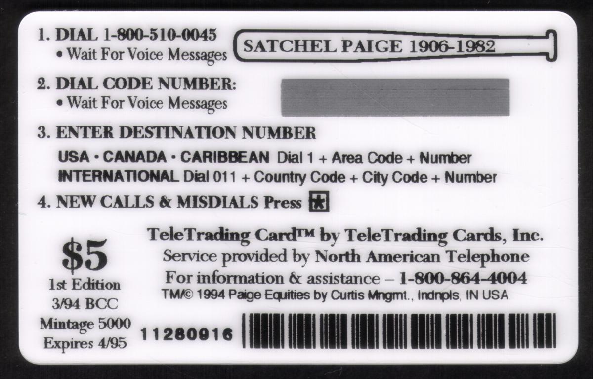 The denomination of the card is $5, prominently displayed in the upper right corner. The bottom left corner includes a facsimile signature of Satchel Paige, along with the text "TeleTrading Card," indicating the card’s issuing company.